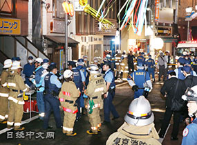 | 在事發現場的商店街展開調查的東京警方和消防隊員(8月7日晚,東京都杉並區) |