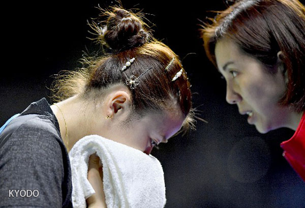 | 福原愛在比賽落後李曉霞時聽教練指導 |