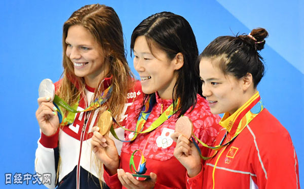 | 分獲女子200米蛙泳金銀銅牌的日本選手金藤理繪(中)、俄羅斯選手尤麗婭・埃菲莫娃(左)、中國選手史婧琳(右) |