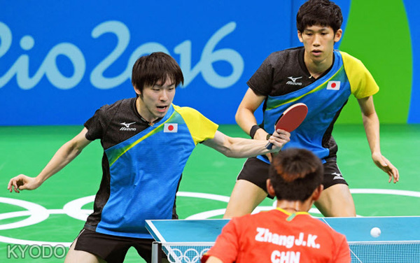 | 男兵團體決賽第3場比賽,日本隊丹羽孝希和吉村真晴對陣中國隊張繼科和許昕,結果1-3落敗(17日,里約,kyodo) |
