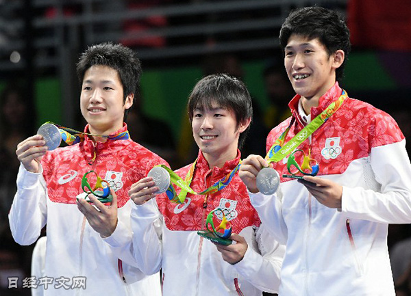 | 獲得兵乓球男子團體銀牌的日本隊(17日,里約) |