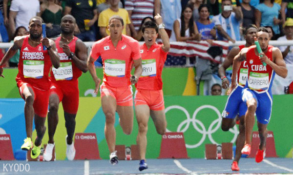 | 男子4×100米接力預賽第2組比賽中的日本隊(18日,里約,kyodo) |
