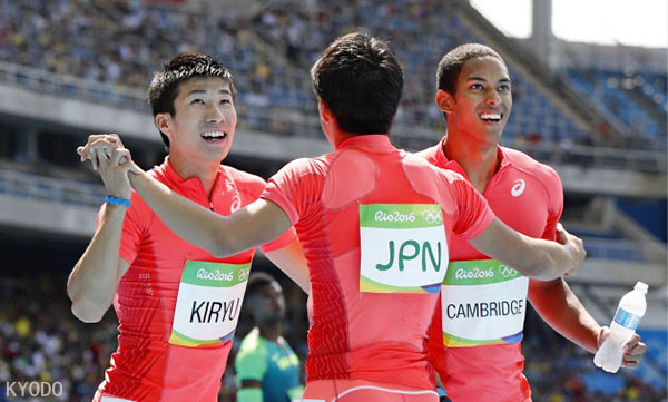 | 慶祝闖入決賽的日本選手(左起)桐生祥秀、山縣亮太、康橋飛鳥(18日,里約,kyodo) |