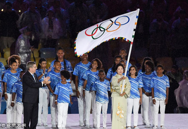 | 身穿和服的東京都知事小池百合子從國際奧會(IOC)主席湯瑪士·巴赫手中接過奧運五環旗(21日,里約) |