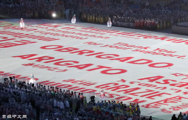 | 在閉幕式會場中出現的各國語言的「謝謝」(21日,里約) |