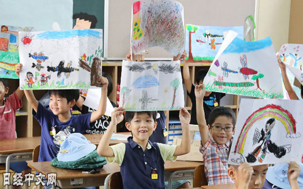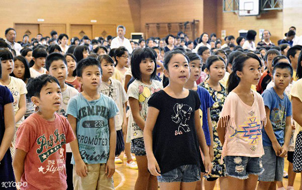 | 在小學開學典禮上唱校歌的日本熊本縣的小學生(8月22日上午,熊本縣益城町的小學) |