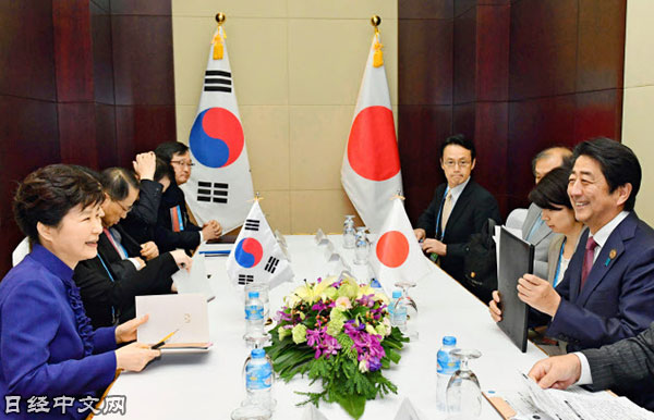 | 舉行會談的日本首相安倍晉三與南韓總統朴槿惠(7日,寮國永珍) |