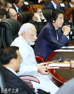 | 出席東亞峰會的日本首相安倍(右)、中國國務院總理李克強(左)等(8日、寮國永珍) |