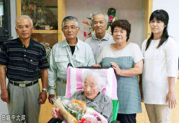 | 同孫輩等合影的日本國內最長壽老人田島Nabi(前方中間,居住於鹿兒島縣喜界島,照片由家屬提供) |