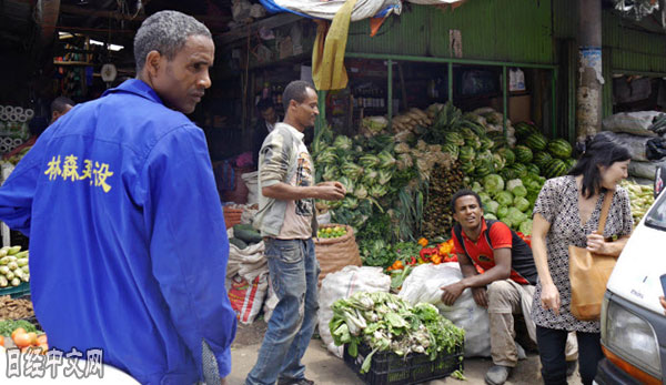 | 市場上擺放著面向中國人銷售的蔬菜。衣索比亞人身穿的上衣也印著中文。 |