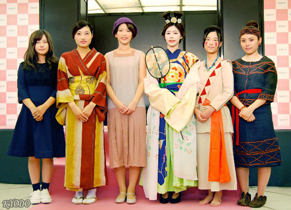 | 日本大學生扮演的日本各個時代的美女形象(從右到左分別為繩文、古墳、奈良、大正、現代,9月15日下午,大阪市,kyodo) |