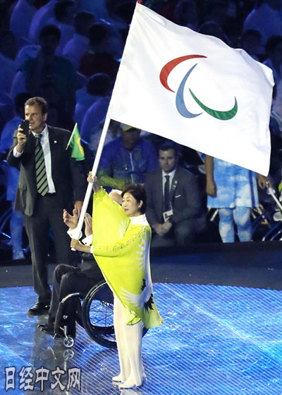 | 東京都知事小池百合子接過殘奧會旗幟(18日,里約) |