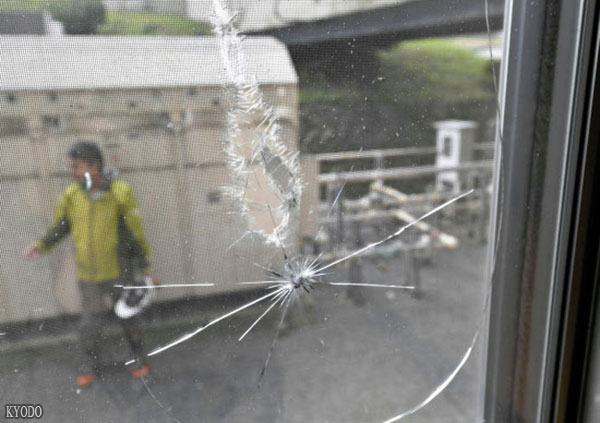 | 國立阿蘇青少年交流之家的玻璃窗被火山噴石砸裂(10月8日上午,熊本縣阿蘇市,Kyodo) |