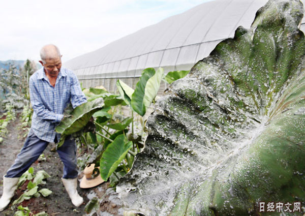 | 一名農民正在清洗落在芋頭葉片上的火山灰(10月8日,熊本縣阿蘇市) |