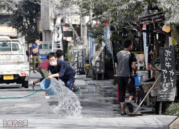 | 人們正在清洗阿蘇神社前的路上的火山灰(10月8日上午,熊本縣阿蘇市) |