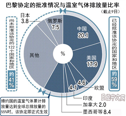 中國也在9月于杭州召開的二十國集團(G20)首腦峰會的議題中重視巴黎協定這一議題。類似的行動在3月的中美首腦會談中也顯示出跡象。但是日本首相官邸卻輕視了中美的動向。其原因是《巴黎協定》的生效條件為(1)批准國至少超過55個國家;(2)批准國的溫室氣體排放量佔全球總排放量的55%。僅僅中美兩國採取行動離達到該條件仍很遙遠。