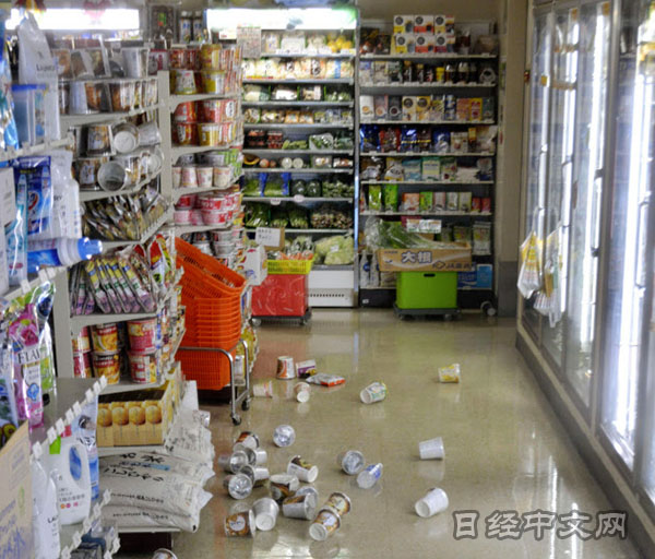 | 地震引起的晃動導致便利店內的商品散落一地(22日上午,日本福島縣磐城市) |