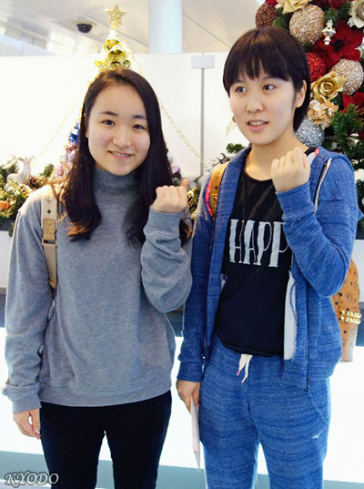 | 平野美宇(右)和伊藤美誠在出發前(11月29日,日本羽田機場,Kyodo) |