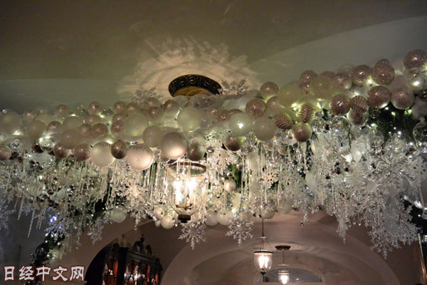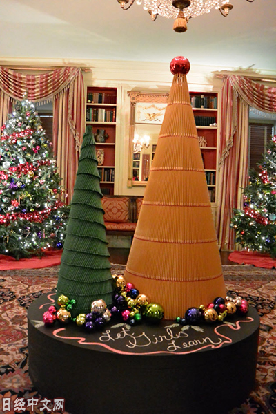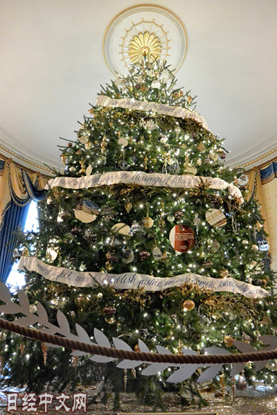| 安置在藍廳的高約5.8米的聖誕樹上,裝飾著寫著家人對駐海外美軍士兵祝福的卡片 |