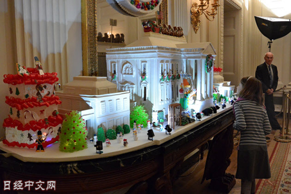 | 用糕點製作的白宮,內部佈置有小型吊燈等裝飾 |