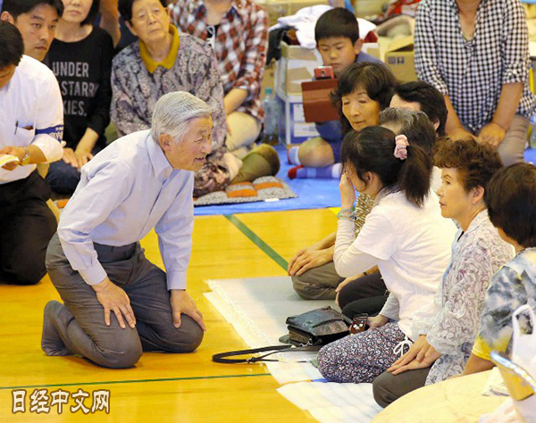 | 在地震災區看望災民的日本明仁天皇(2016年5月19日,日本熊本縣南阿蘇村) |