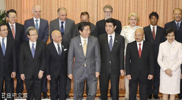 | 安倍與會講日語的知日派各國駐日大使合影(10日,日本首相公邸) |