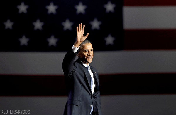 | 在發表告別演講會場向聽眾揮手的歐巴馬(10日,芝加哥,reuters-kyodo) |