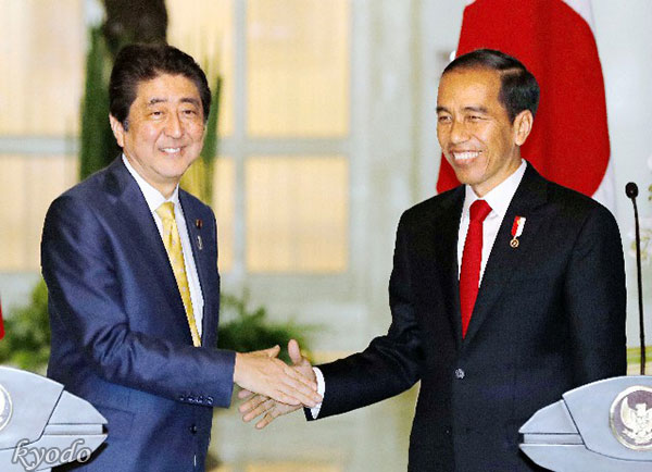 | 記者會後安倍與印尼總統佐科(右)握手(1月15日,茂物總統府,KYODO) |