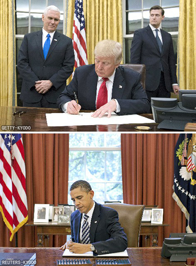 | 上圖為川普簽署命令 (1月20日,GRTTY-KYODO),下圖為歐巴馬簽署命令 (2011年8月,REUTERS-KYODO) |
