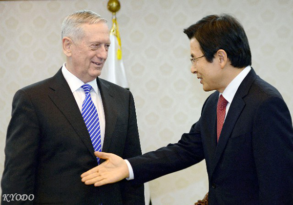 馬蒂斯2日與南韓代理總統兼總理黃教安等人舉行了會談。南韓政府表示,雙方一致認為,如果朝鮮試射可將美國本土納入射程的洲際彈道導彈(ICBM)等發動進一步挑釁,美韓將強力應對。美國在川普政權下也將繼續向南韓提供包括「核保護傘」在內的擴張威懾力。