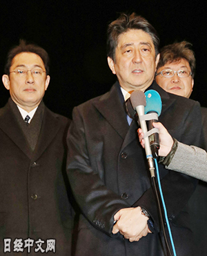 | 啟程訪美前,安倍接受記者提問。左邊為日本外相岸田文雄(2月9日,羽田機場) |