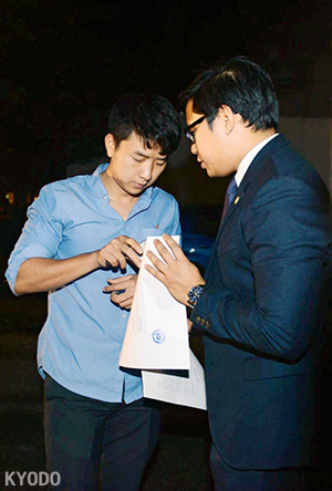 | 馬來西亞外交部人員(右)將「驅逐令」交給朝鮮駐馬來西亞大使館職員(3月4日,Kyodo) |