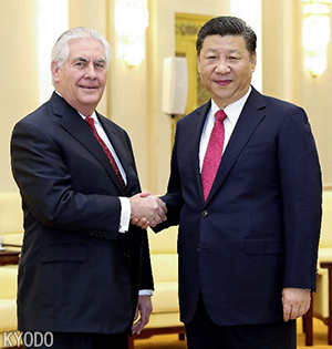 中國國家主席習近平(右)與美國國務卿蒂勒森握手(3月19日,北京,Kyodo) |