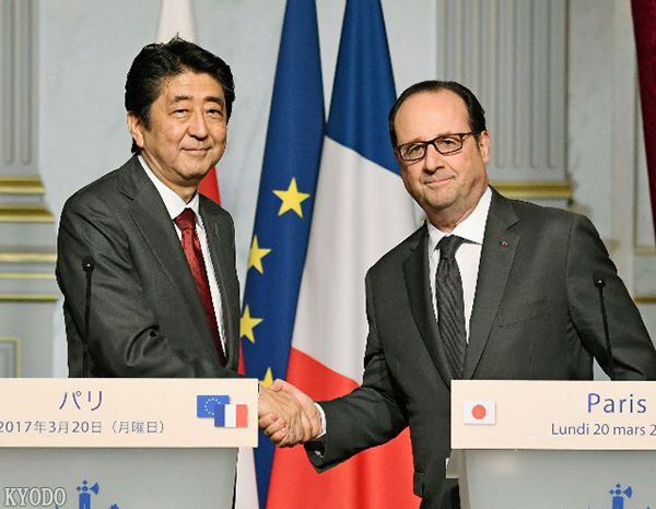 日本首相安倍晉三當地時間3月20日晚間與法國總統歐蘭德在位於巴黎的法國總統府舉行了會談。安倍指出在中國展開活動的印度洋和太平洋「確保自由而開放的海洋秩序至關重要」,顯示出在海洋安全保障領域深化與法國合作的想法。日法兩國政府就4月底法國海軍訓練艦隊訪日、實施包括美國和英國在內的全面共同訓練達成了一致。