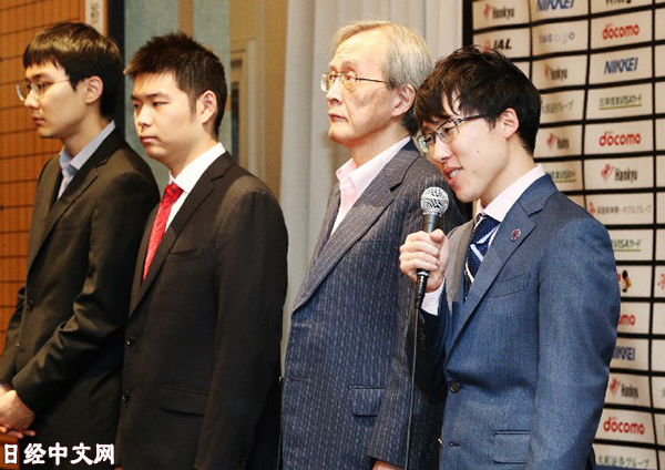 | 日本棋手井山裕太王座(右1)發言(3月23日,大阪市) |