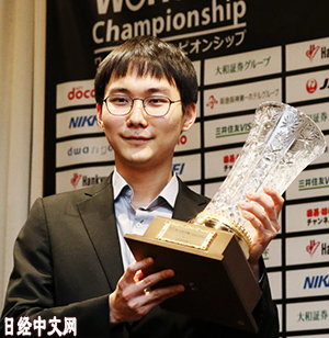 | 奪冠的南韓棋手朴廷桓九段手捧獎盃(3月23日,大阪市) |