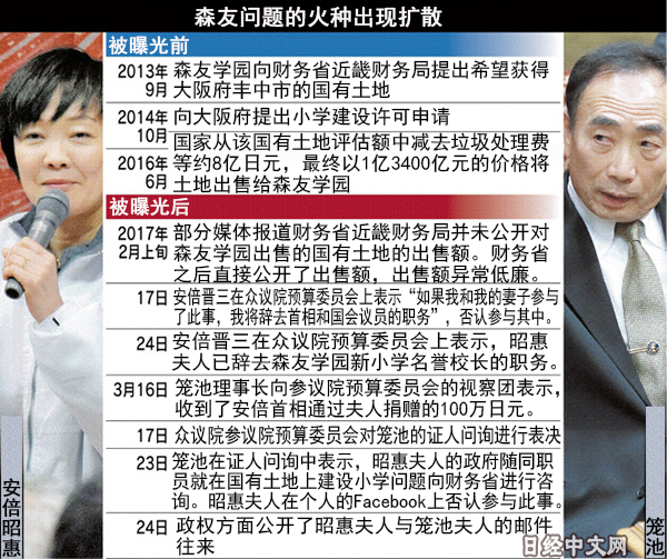 圍繞日本學校法人「森友學園」低價獲得國有土地的問題變得愈發混亂。已表明辭去理事長職務的籠池泰典主張安倍晉三的夫人安倍昭惠參與其中,另一方面,安倍則正面否定了籠池的主張。但是,目前雙方都沒有提交決定性的證據。在呈現出長期化趨勢的該問題上,安倍表現出強硬與焦慮相互交織的狀態。