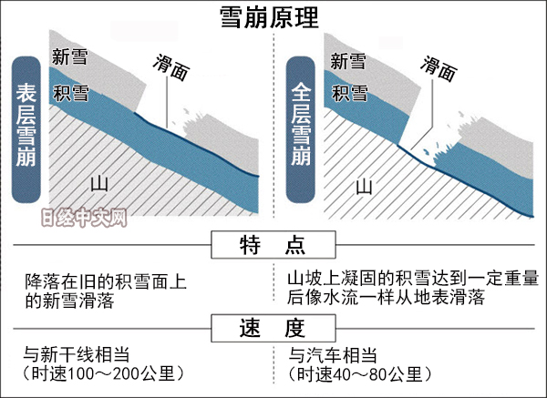 日本山嶽協會專務理事尾形好雄表示,初春時白天融化的積雪容易在夜間結冰凝固。他同時説,「(冰層)上面新積的雪不會吸附於以前的積雪上,中間會産生分層。受到踩踏等衝擊轟然滑落的就是表層雪崩」。