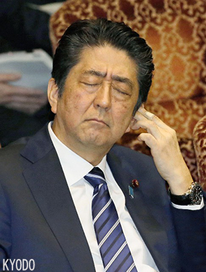 | 在參議院預算委員會上表情疲憊的安倍(3月27日,東京,Kyodo) |