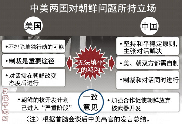 美國總統川普在與中國國家主席習近平舉行的為期兩天的會談中,一直強烈要求中國採取措施解決朝鮮的核與導彈開發問題。中國雖然同意加強合作,但沒有改變慎重姿態,雙方並未就迫使朝鮮放棄核武器的具體路線達成一致。美國打算要求中國採取「下一步措施」,繼續加強施壓,中美之間的拉鋸戰依然看不到出口。