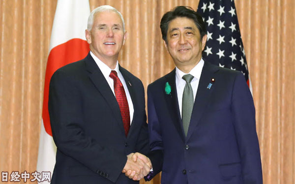 4月18日下午,日本首相安倍晉三與正在訪日的美國副總統彭斯在首相官邸開始舉行會談。安倍在會談伊始就提及朝鮮局勢,強調稱,「雖然必須通過外交手段和平解決(朝鮮問題),但為對話而進行對話沒有意義。為了讓朝鮮響應對話需要施加壓力」。