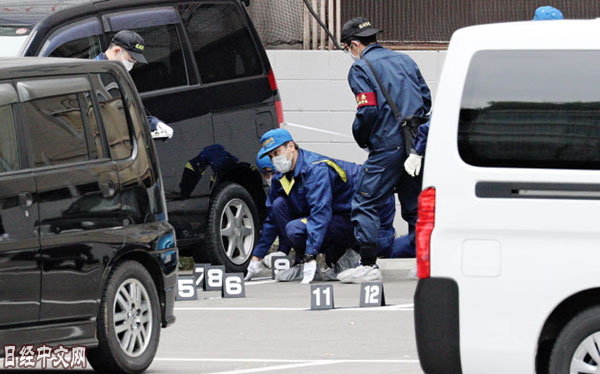 | 福岡縣警方正在案發現場附近進行調查(4月20日,福岡天神) |