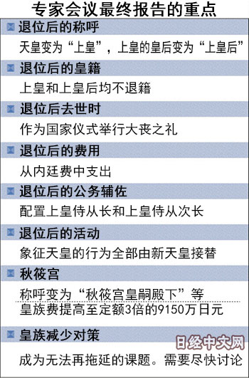 討論天皇退位問題的日本政府專家會議向日本首相安倍晉三提交了有關天皇生前退位的最終報告。該報告僅限一代天皇,主要內容有退位後的稱呼變為「上皇」,以及象徵天皇的行為全部由新天皇接替,退位的制度設計成為重點。日本政府將於5月內提出根據此報告製成的特例法案,力爭在本屆國會上通過。預計天皇退位時間為2018年內。在日本現行憲法中沒有規定的天皇生前退位將成為現實。