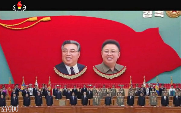 | 朝鮮中央電視臺在24日報道紀念建軍85週年中央報告大會的畫面(4月24日,Kyodo) |