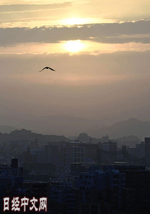 | 受沙塵天氣影響變得矇矓的夕陽(5月6日,日本福岡縣福岡市) |