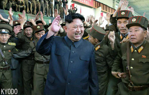 | 朝鮮《勞動新聞》5月15日刊登的朝鮮勞動黨委員長金正恩(中間)觀看發射實驗的照片(Kyodo) |