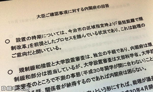 圍繞日本岡山縣岡山市學校法人「加計學園」的獸醫系新設計劃,明確記載有「首相授意」等內容的文件被曝光,日本政府與在野黨的攻防戰仍在繼續。對於新院系的設置計劃,政府是否違規為其「開後門」成為了焦點。在野黨追究責任,認為文部科學省參與其中,存在「揣摩上意」等問題。但政府並不承認,否認了「安倍晉三首相發出指示」等內容。