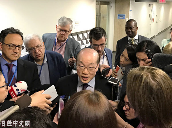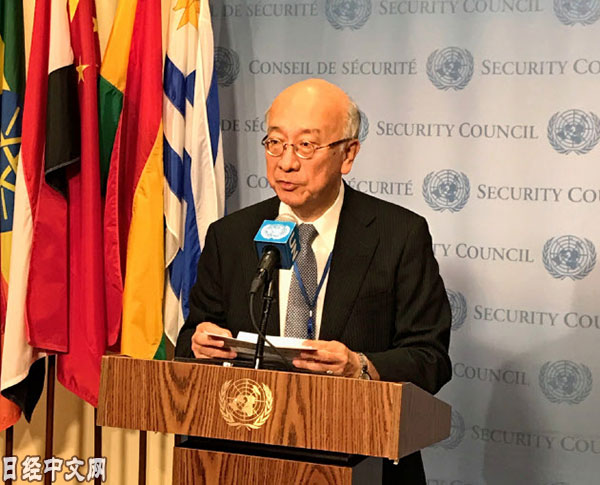 | 日本駐聯合國大使別所浩郎在緊急會議結束後舉行記者會(5月23日,紐約聯合國總部) |