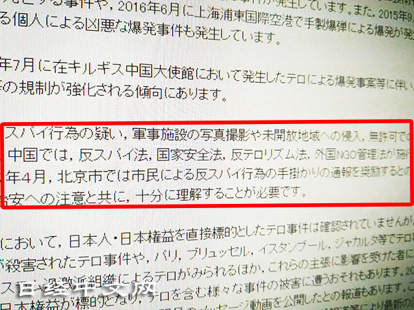日本外務省5月份更新了「海外安全」主頁中有關中國方面的資訊。被懷疑從事間諜行為的原因被認為大致有兩個,其中之一是用智慧手機等拍照。