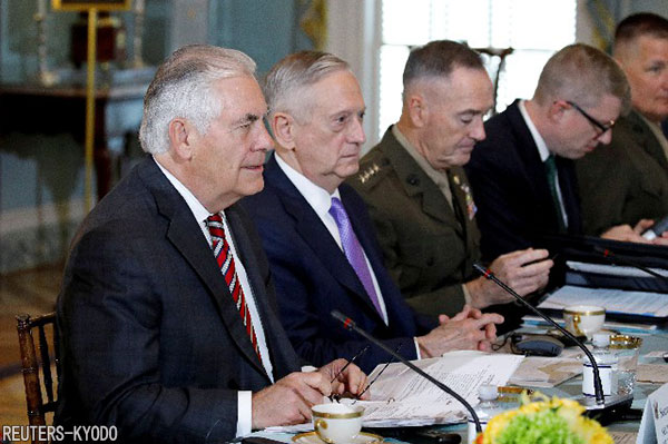 | 在中美進行外交安全對話前,美國國務卿蒂勒森和國防部長馬蒂斯與中方人員會面(reuters-kyodo) |